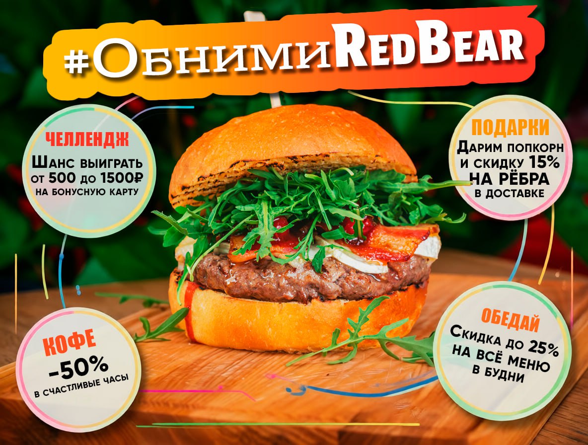 #ОбнимиRedBear можно не только в кафе, но и с доставкой! Сфотографируйте, как вы «обнимаете» наш бургер, рёбрышки или даже бокс с попкорном у себя дома — и вы уже в игре! Победителей ждут бонусы на карту: 500, 1000 и 1500 ₽. Не упустите шанс — публикуйте фото в VK с хештегом до 1 февраля!