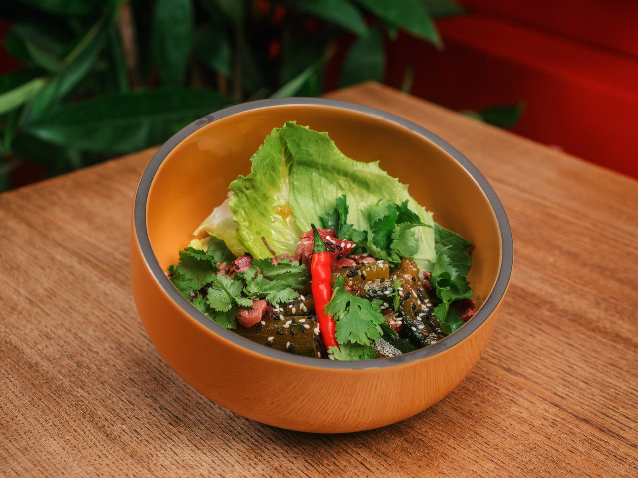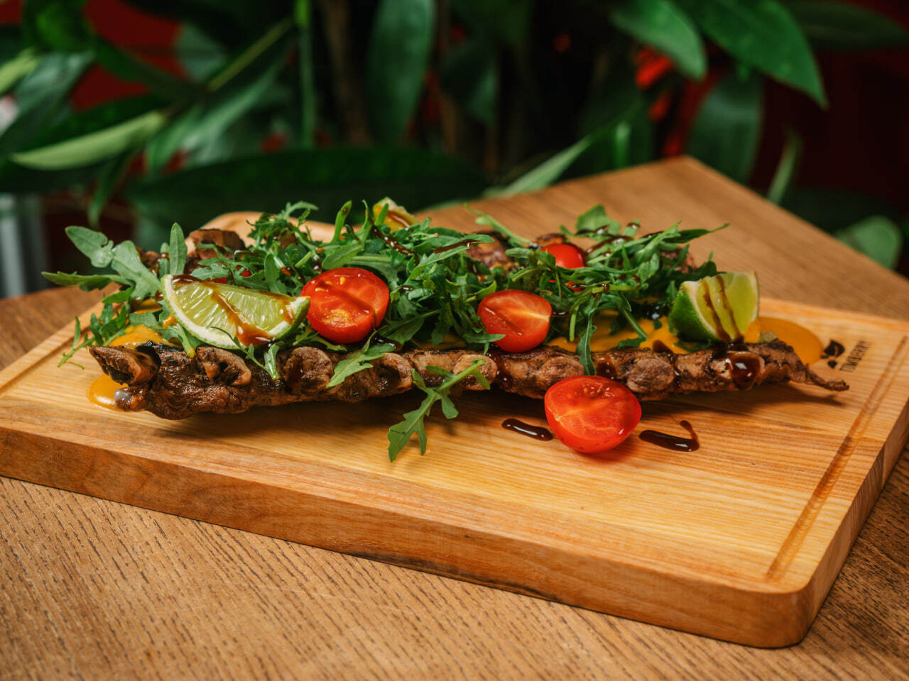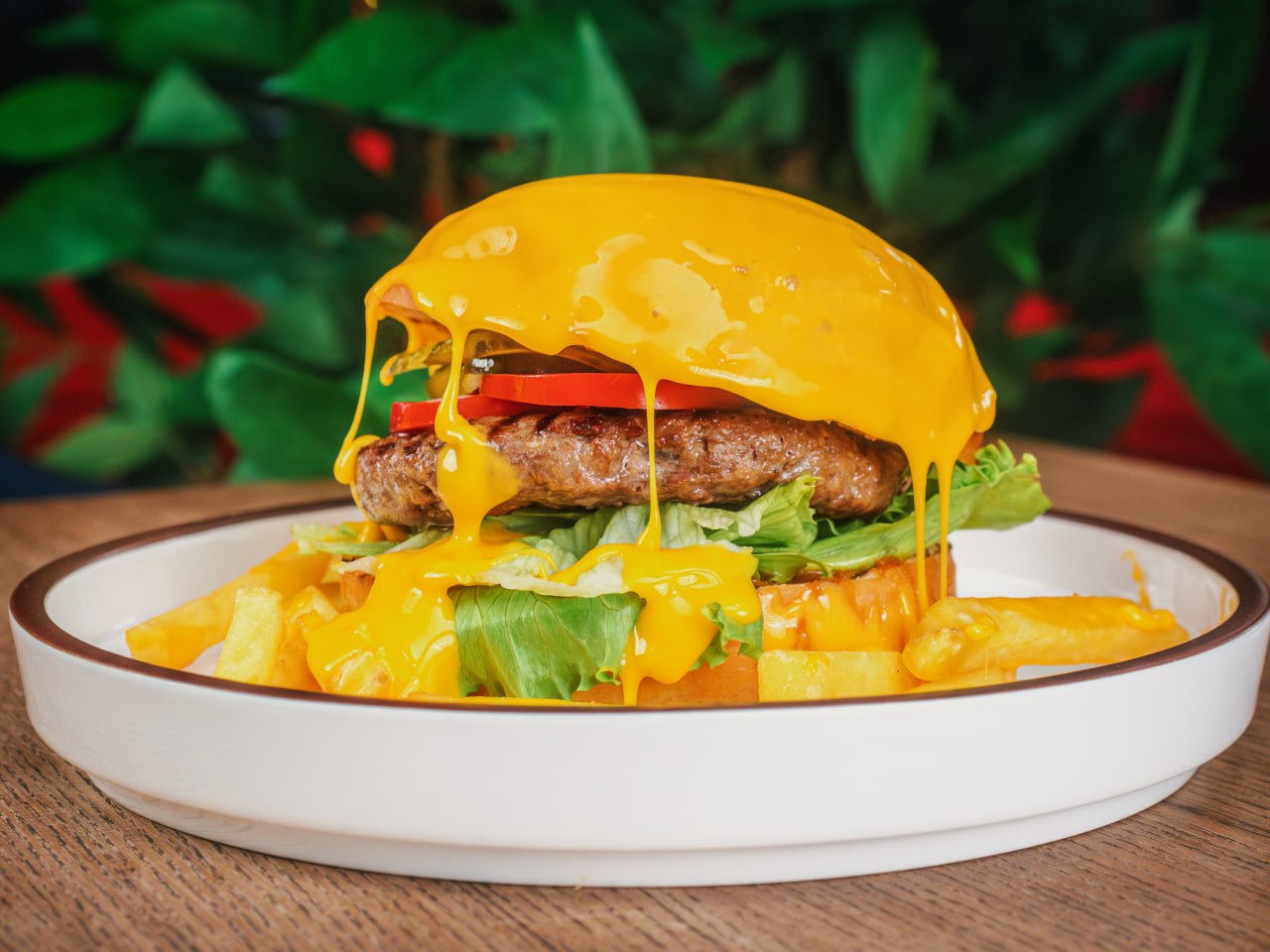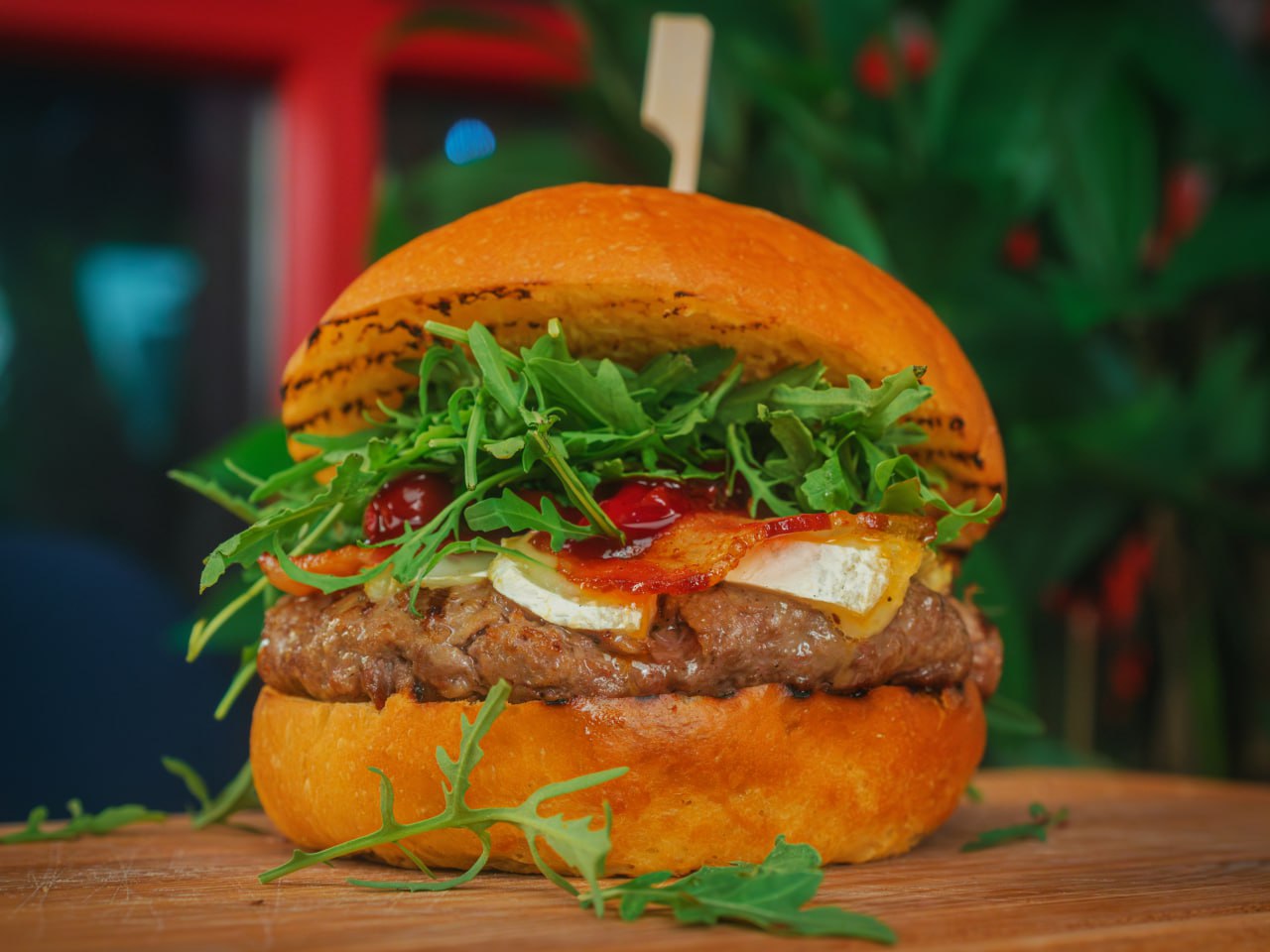 Пшеничная булка и котлета из говядины, лук репчатый, огурцы маринованные, айсберг, перец чили, помидоры, сыр моцарелла, соус красное вино-bbq