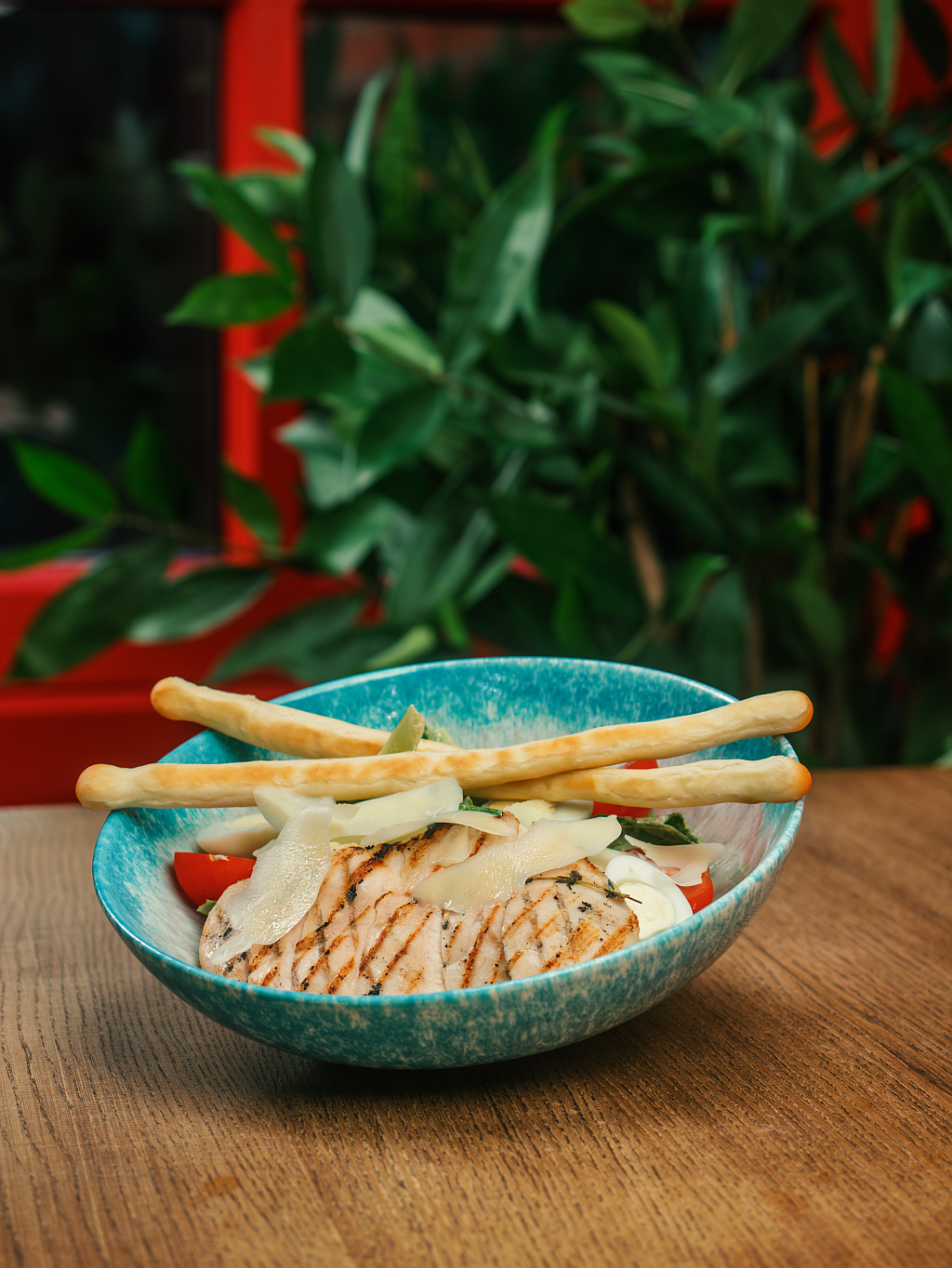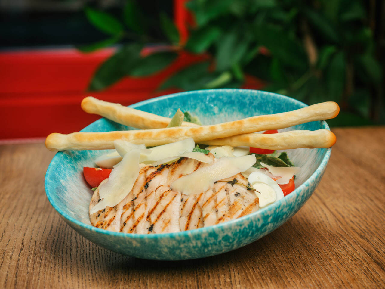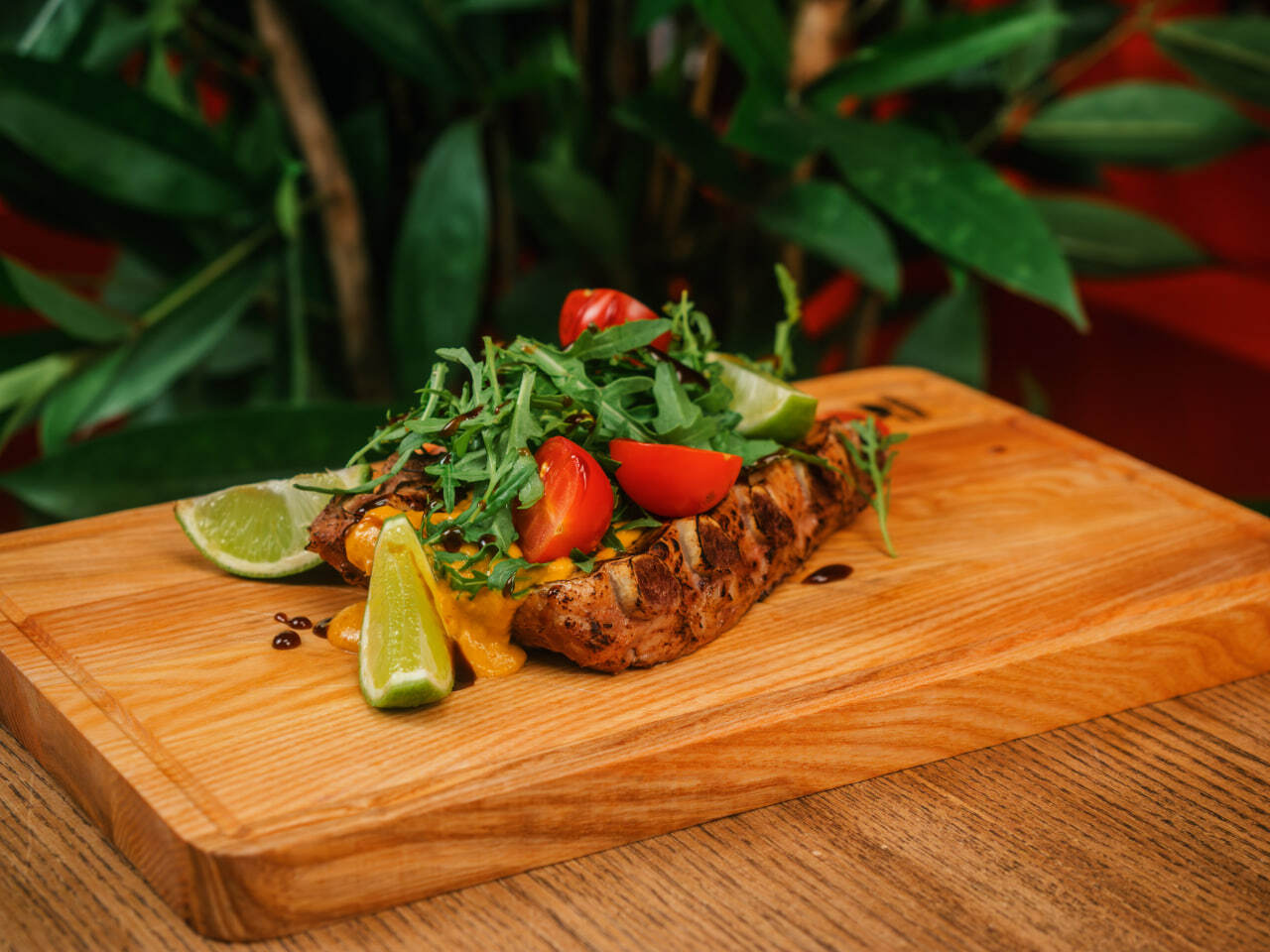 Пшеничная булка и куриная котлета, салат айсберг, помидоры, соус йогуртово-горчичный