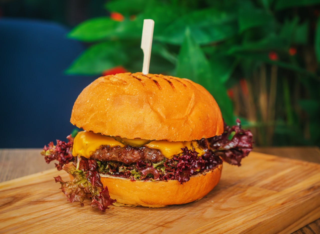 Пшеничная булка и котлета из говядины, бекон, сыр чеддер, айсберг, огурцы маринованные, помидоры, соус bbq